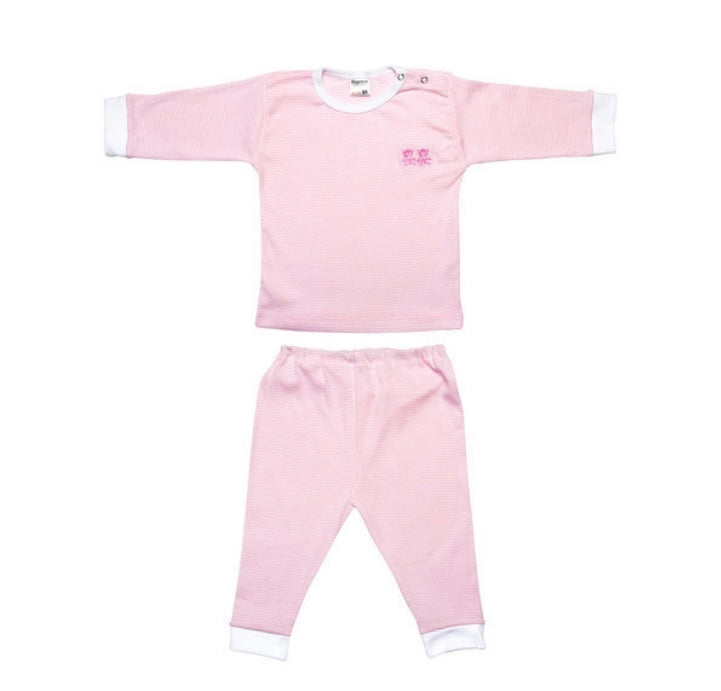 Mooie pyjama, gemaakt van een mooie zachte fijn rib, met een subtiel streepje. De hals is afgezet met boord en de mouwen en pijpen met een elastische manchet. Op de linkerborst zit een leuk borduursel van 2 Beertjes.